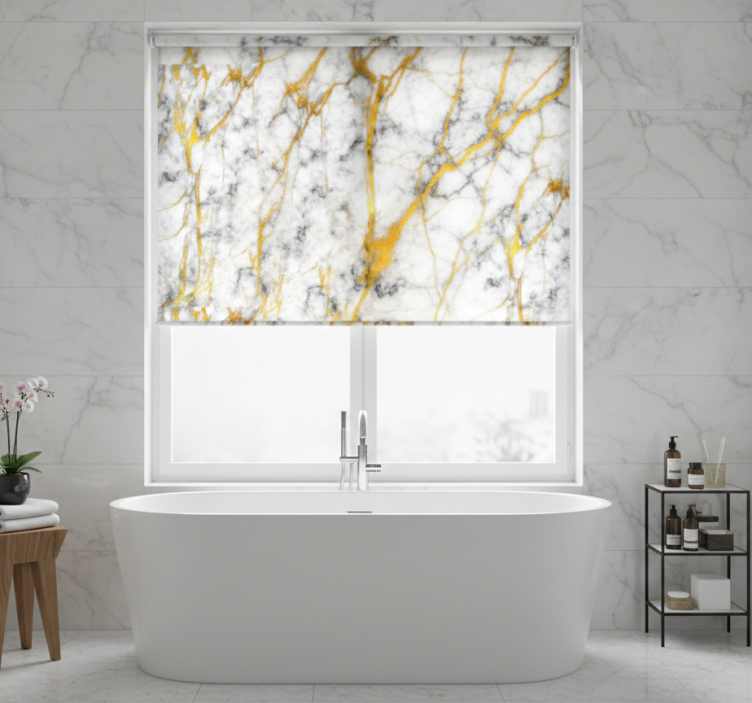 Elevate your interior design with the Bathroom roller blind in elegant gray and gold marble bathroom roller blind. This stunning piece is not just a window covering; it’s an artistic statement that brings elegance and warmth into your bathroom. The chic marble design complements various décor styles, making it a versatile choice for anyone looking to enhance their space. Let your bathroom shine with this beautiful roller blind that inspires relaxation and tranquility!