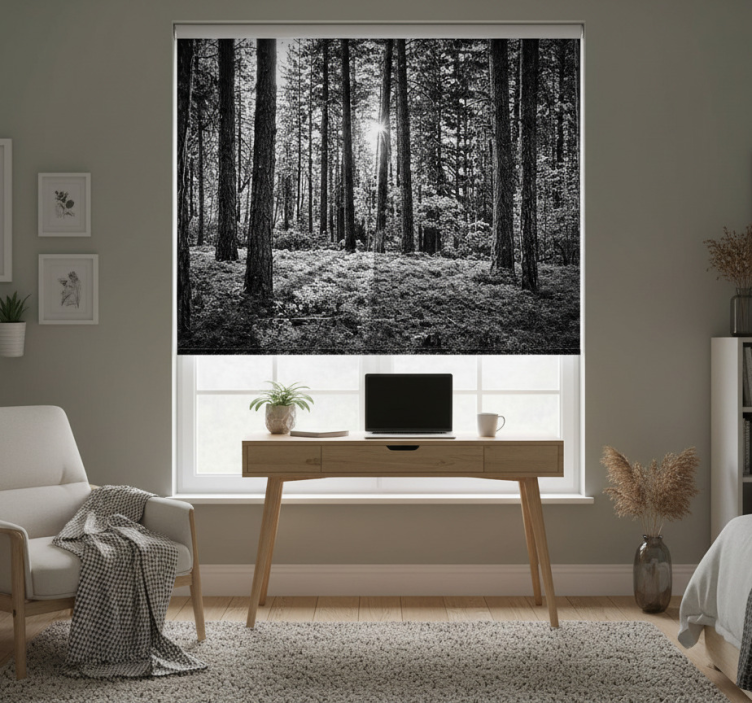 Reference: E8724Transform your space with our Black roller blind monochrome forest design, a stunning visual masterpiece that captures the essence of nature. This design features intricate forest motifs in a monochrome palette, creating an elegant yet modern aesthetic that seamlessly blends with any decor. With its easy assembly in just two clicks, effortless cleaning, and quick disassembly, this roller blind is not only beautiful but also practical. It effectively protects your room from direct sunlight while providing the perfect level of privacy, allowing you to enjoy the view without being seen. Ideal for enhancing the atmosphere of your home, this roller blind is fully customizable to fit your window perfectly.