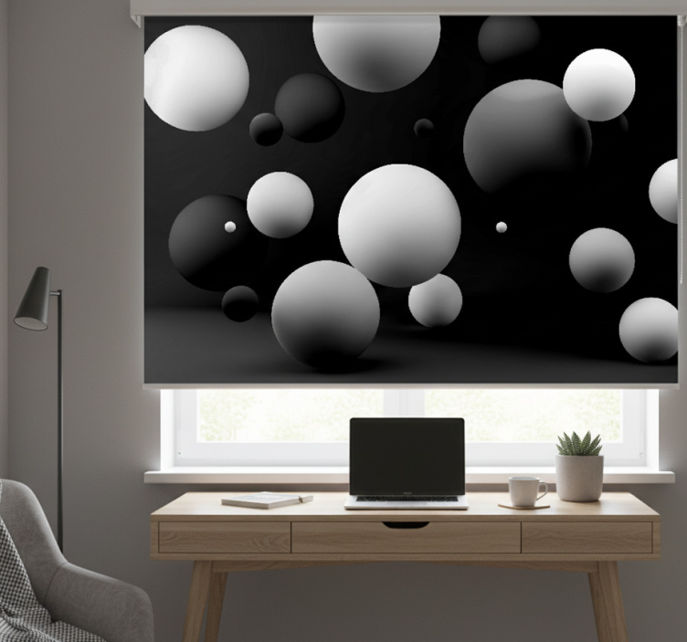 Reference: E8739Introducing our stunning Black roller blind with white spheres on black, a perfect blend of style and functionality! The captivating design features bold black fabric adorned with elegant white spheres, creating a striking contrast that enhances any room's aesthetic. This roller blind is not only a visual delight but also offers practicality with its easy assembly, easy cleaning, and the ability to regulate room temperature while providing privacy.