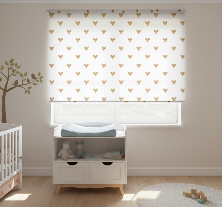 The Children room roller blind golden heart on white children room roller blind is the perfect addition to your child's room, combining style and practicality. Its beautiful heart motifs bring a touch of love and warmth, making it an inspiring choice for parents looking to create a joyful environment. This roller blind serves as a captivating focal point while ensuring that your little one's privacy is maintained. Let this charming design spark imagination and happiness in your child's everyday life!