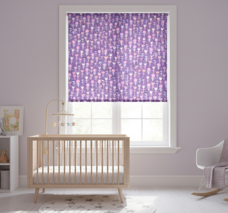 Children room roller blind in purple flower pattern