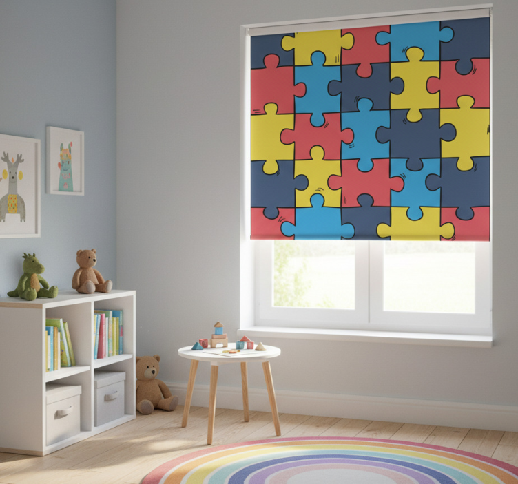 Reference: E7216Transform your child's space with our Children room roller blind rainbow puzzle. This delightful design features vibrant colors and playful puzzle pieces that will spark joy and imagination. With its easy assembly in just two clicks, easy-to-clean surface, and ability to protect rooms from direct sunlight while providing privacy, this roller blind is perfect for any children's room. The charming graphics not only enhance the decor but also create a fun and engaging environment for your little ones!