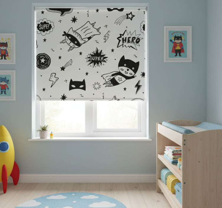 Reference: E7218Transform your child's space with our Children room roller blind superhero comic design! This vibrant roller blind features an exciting superhero comic design that sparks imagination and creativity. The colorful graphics showcase heroic characters in action, making it a perfect addition to any child's room. With easy assembly in just two clicks, easy cleaning, and the ability to regulate room temperature, this roller blind combines style and functionality seamlessly!