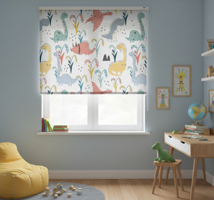Reference: E6903Transform your child's space with our Children room roller blind with dinosaurs and trees! This enchanting design features vibrant dinosaurs playfully roaming among lush trees, creating a whimsical atmosphere that sparks imagination and adventure. The playful graphics not only brighten up the room but also serve as an educational tool, inviting children to explore their creativity while enjoying a fun and lively environment.