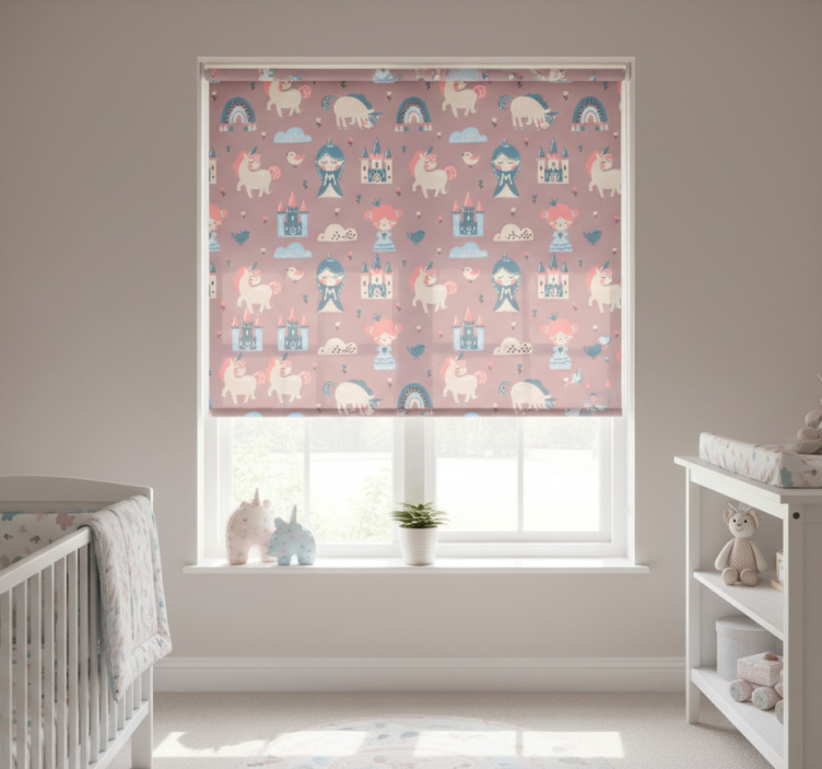 Reference: E6981Transform your child's space with our enchanting Children room roller blind pastel unicorns and princess design! Featuring delightful pastel unicorns and charming princesses, this roller blind adds a whimsical touch to any room. The vibrant colors and playful patterns inspire imagination and creativity, making it the perfect addition to your child's bedroom. With easy assembly and easy cleaning, this roller blind is as practical as it is beautiful!