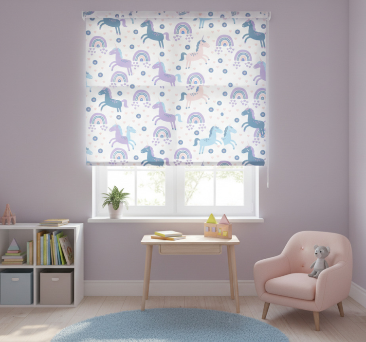 Reference: E7198Transform your child's space with our Children room roller blind with pastel unicorns pattern, featuring delightful pastel unicorns dancing across a soft, whimsical background. This enchanting design brings a touch of magic to any room, creating a cheerful atmosphere that sparks imagination and joy. The roller blind not only enhances the aesthetic appeal but also provides practical benefits, making it a perfect addition to your child's room.