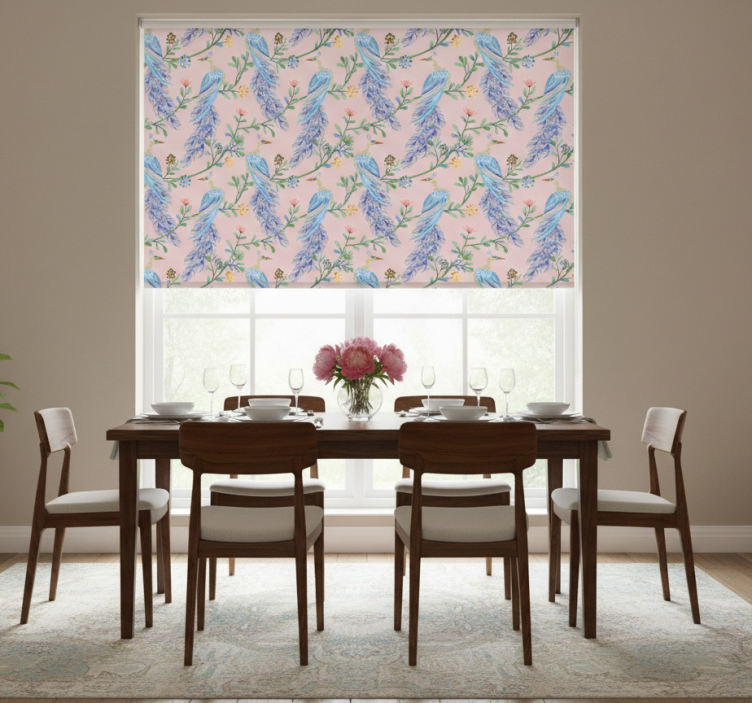 Dining room roller blind birds in a pink paradise