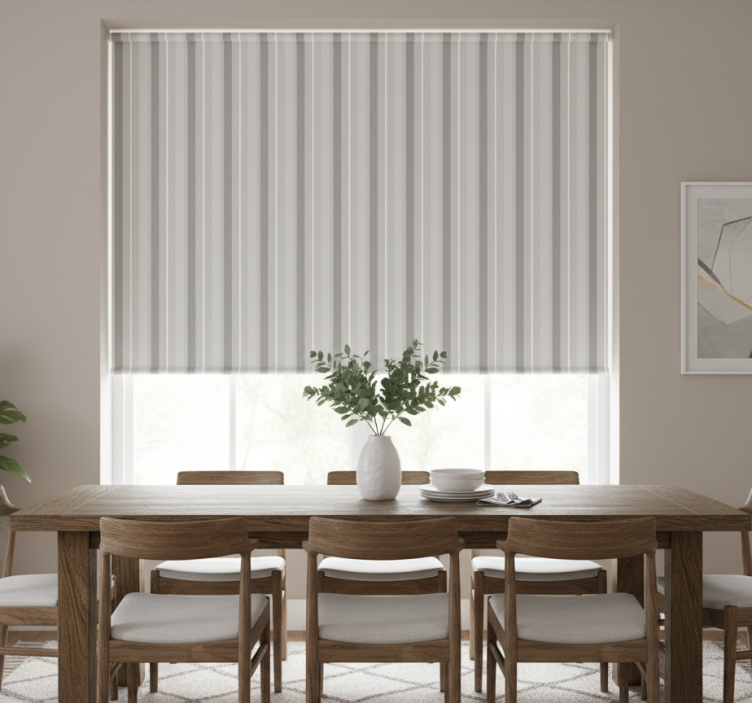 Reference: E6734Transform your space with our Dining room roller blind glamour grey stripes. This exquisite roller blind features a sophisticated grey striped design that effortlessly combines elegance with functionality. Perfectly suited for modern interiors, it adds a touch of glamour while providing essential features such as easy assembly in 2 clicks, easy disassembly for quick cleaning, and effective sunlight protection. Enjoy your privacy when lowered, regulate the room temperature, and enhance the security of your home with a stylish solution that allows you to see without being seen!