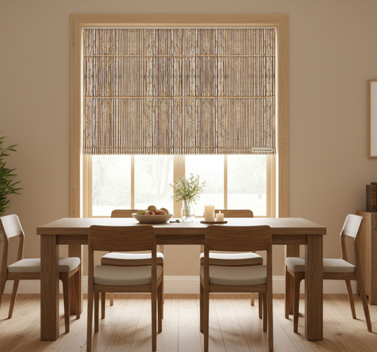 Reference: E6549Introducing our stunning Dining room roller blind handcrafted bamboo look, a perfect blend of elegance and functionality! This beautiful roller blind boasts a unique bamboo design that brings a touch of nature indoors, seamlessly enhancing your home decor. Crafted with care, it features easy assembly in just 2 clicks and effortless cleaning, allowing you to maintain a fresh and inviting atmosphere. With a special focus on privacy and light control, this blind protects your room from direct sunlight while ensuring you can enjoy the view without being seen.