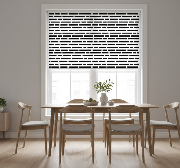 The Dining room roller blind in black and white rectangles dining room roller blind is more than just a functional window treatment; it is a statement piece that elevates your interior design. Its striking design adds a touch of sophistication and style, making it an ideal choice for anyone looking to enhance their dining area. With its modern aesthetic, this roller blind harmonizes perfectly with various decor styles, inspiring creativity and a fresh ambiance!