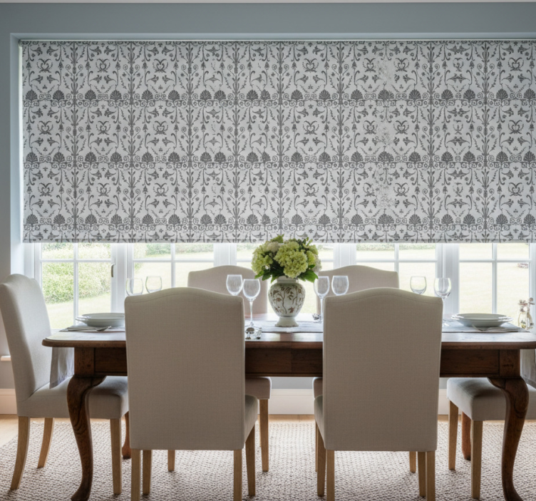 Reference: E6587Transform your living space with our stunning Grey french provincial style dining room roller blind. This beautifully crafted roller blind features a sophisticated design that seamlessly blends elegance and functionality. The Grey french provincial style dining room roller blind offers easy assembly in just two clicks, is easy to clean, and can be disassembled just as quickly, making maintenance a breeze. Protect your home from direct sunlight while enjoying your privacy when lowered, and effortlessly regulate your room temperature. With 100% customizable measurements and three different textures to choose from, this roller blind enhances your home's decor while providing security, allowing you to see outside without being seen!