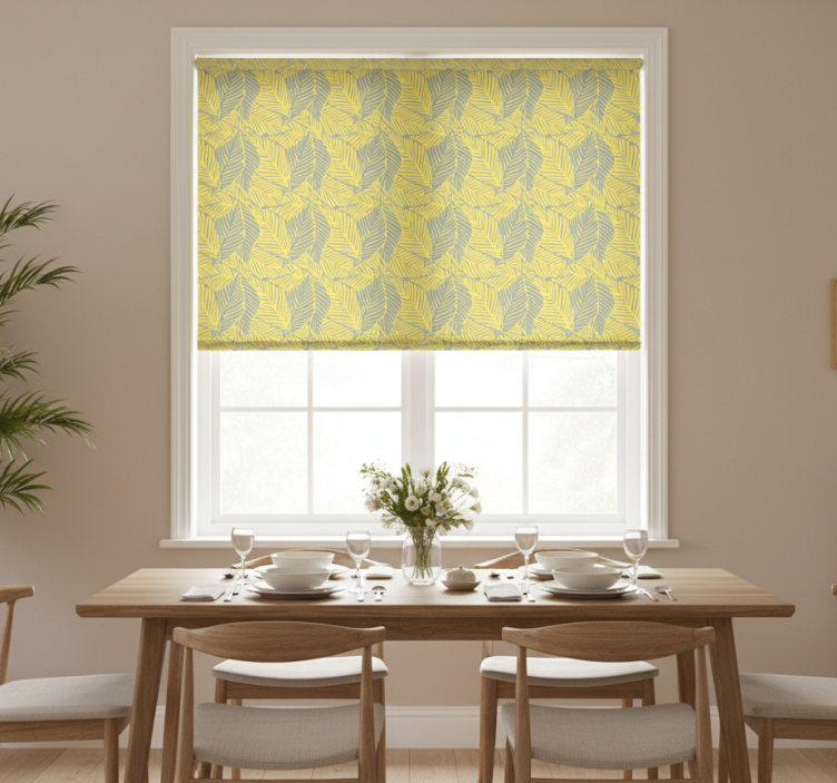 Transform your space with our stunning Dining room roller blind in pantone tropical leaves, featuring a vibrant design inspired by lush tropical foliage. This roller blind not only enhances the aesthetic appeal of your dining area but also offers practical benefits such as easy assembly in just two clicks, effortless cleaning, and the ability to regulate room temperature, making it a perfect addition to any home!