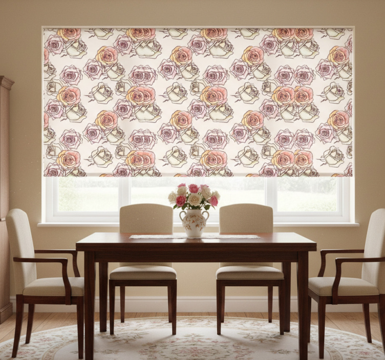Reference: E6601Transform your space with our stunning Dining room roller blind roses pattern english style. This exquisite design features an enchanting roses pattern that effortlessly blends elegance with a touch of charm. The soft hues and intricate floral details create a captivating atmosphere, making it the perfect addition to any dining room decor. With easy assembly in just 2 clicks and effortless cleaning, this roller blind accentuates your home while providing practical benefits such as privacy and sunlight protection. Plus, you can customize your measurements to fit your windows perfectly!
