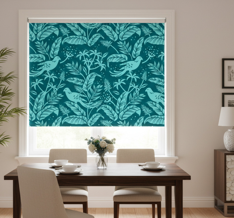 Reference: E6785Transform your living space with our stunning Dining room roller blind turquoise flying birds. Featuring a captivating design of turquoise hues adorned with gracefully soaring birds, this roller blind adds a touch of elegance and whimsy to any dining room. The vibrant colors and enchanting bird motifs create a cheerful atmosphere, making your meals more enjoyable and your home more inviting!