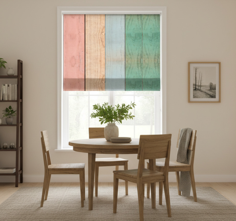 Dining room roller blind with colorful wood texture