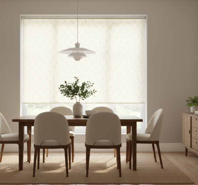 Reference: E6680Transform your living space with our Dining room roller blind with modern white pattern, designed to bring elegance and sophistication to any room. The intricate modern white pattern adds a touch of contemporary flair, making it not only a functional item but also a stunning piece of decor. This beautiful roller blind is easy to clean, offers privacy when lowered, and protects your room from harsh sunlight, all while enhancing the overall aesthetic of your dining area!