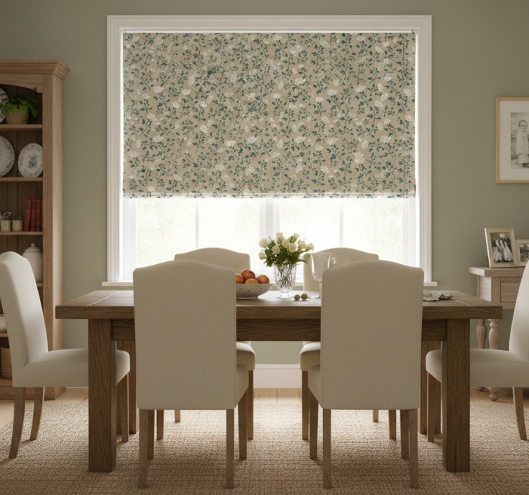 Reference: E6698Transform your living space with our Dining room roller blind with white vintage rose pattern. This exquisite design features delicate white vintage roses that beautifully intertwine with soft green leaves, creating a charming and sophisticated ambiance. The timeless elegance of this roller blind enhances any dining room, making it a perfect addition to your home decor.