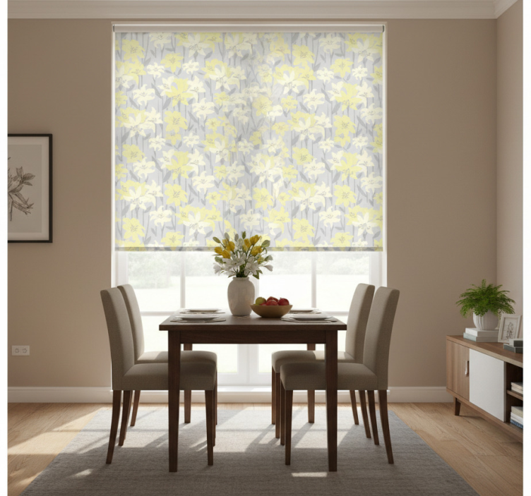 Transform your living space with the Dining room roller blind with yellow flowers on grey dining room roller blind. This exquisite piece not only serves as a practical window covering but also as a stunning decorative element. Imagine inviting friends and family over, where the soft hues of grey and cheerful yellow flowers create a delightful ambiance that sparks joy and conversation! This roller blind enhances the aesthetic of any dining room, making it a must-have for those looking to elevate their interior decor.