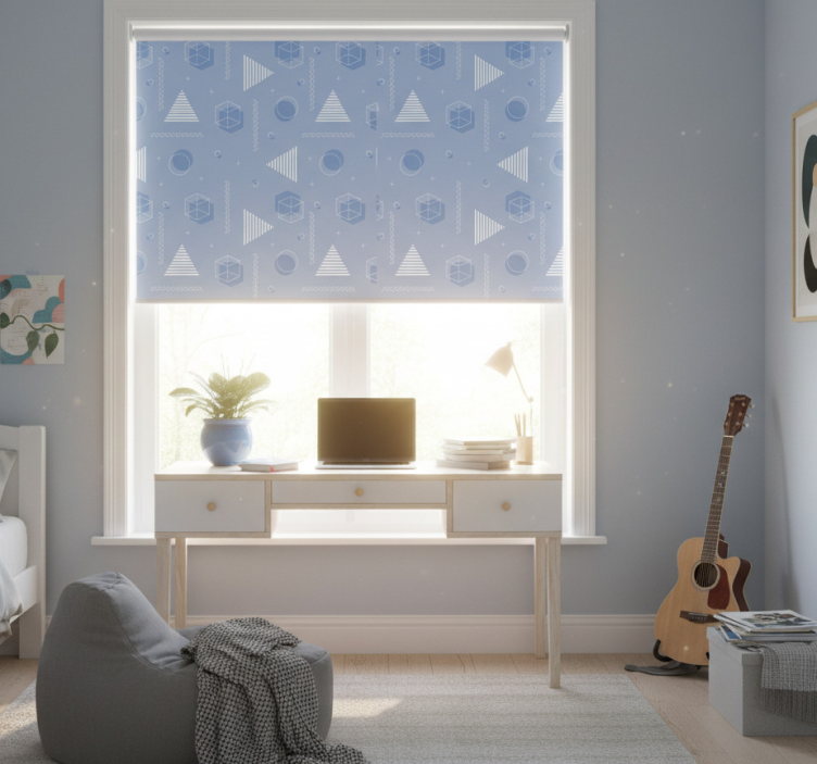 Reference: E7407Transform your space with the stunning Geometric blue teenage bedroom roller blind, designed to elevate any teenage bedroom. This roller blind features a captivating geometric pattern in vibrant blue tones, adding a modern touch while ensuring functionality. With easy assembly in just two clicks, effortless cleaning, and the ability to regulate room temperature, this roller blind is a perfect solution for both style and convenience!