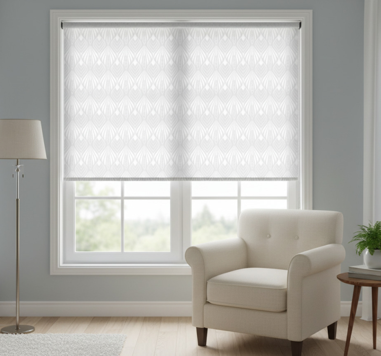 Gray roller blind with white and grey leaves pattern