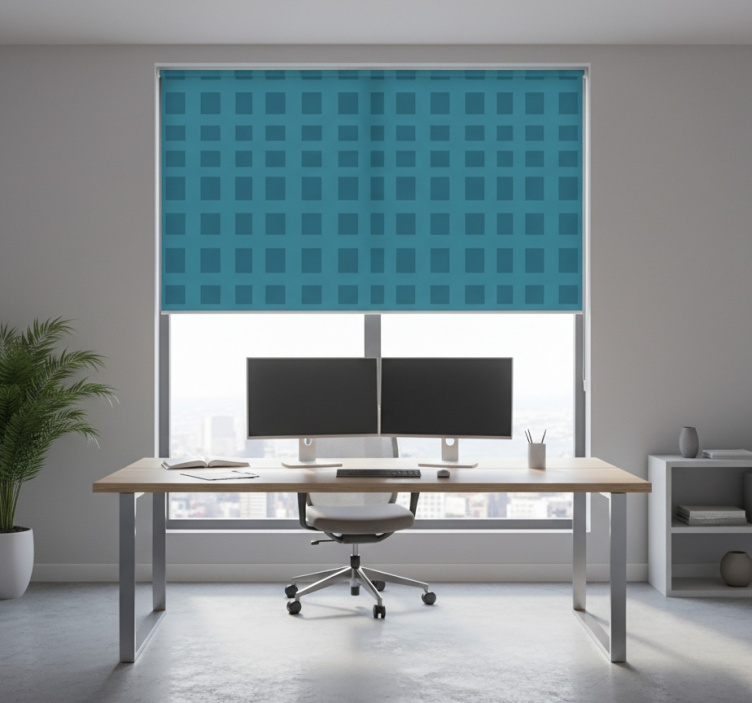 Home office roller blind blue square pattern