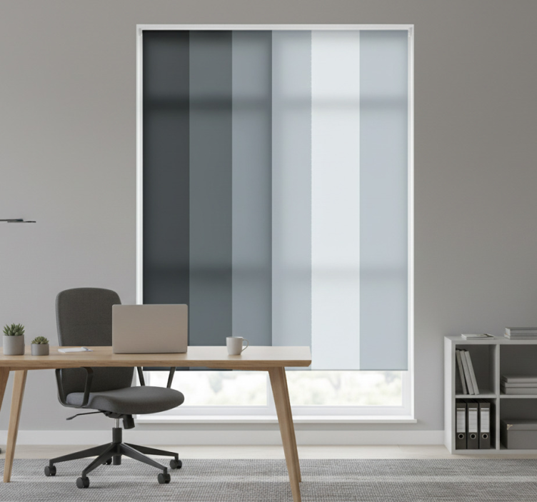 Reference: E6242Transform your workspace with our Home office roller blind elegant vertical gray stripes. This stunning design features sophisticated vertical gray stripes that effortlessly blend modern aesthetics with classic elegance. Not only does it enhance your home office decor, but it also offers practical benefits such as protecting your room from direct sunlight and providing privacy when lowered. Enjoy the convenience of easy assembly and disassembly in just two clicks, making cleaning a breeze while allowing you to maintain a tidy environment.