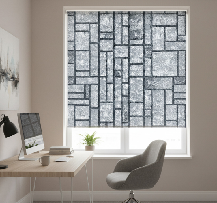Reference: E6223Transform your workspace with our Home office roller blind in gray concrete blocks, designed to elevate your home office aesthetics! Featuring a stunning gray concrete blocks design, this roller blind not only adds a modern touch but also complements various interior styles. Its easy assembly in 2 clicks and simple cleaning process make it a practical choice, while its ability to provide privacy when lowered and regulate room temperature enhances your comfort. Plus, this roller blind offers security by allowing you to see outside without being seen!