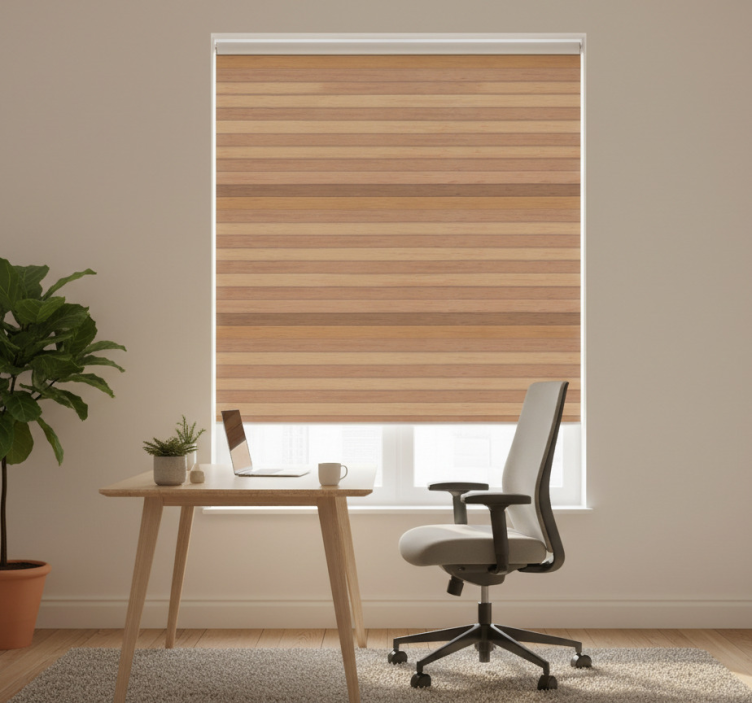 Home office roller blind with elegant rustic wood
