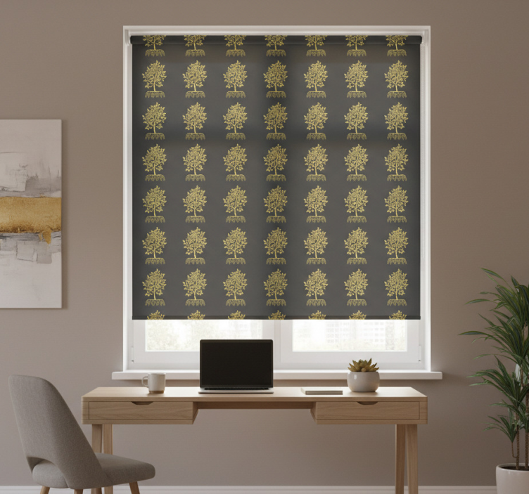 Home office roller blind with golden tree outline