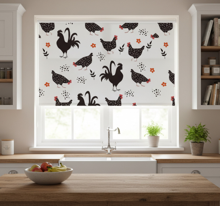 Transform your kitchen with our stunning Kitchen roller blind black and white rooster design! Featuring charming illustrations of roosters in a classic black and white palette, this roller blind brings a rustic yet elegant touch to your space. The intricate graphics create a delightful visual interest, making it a perfect statement piece. With easy assembly, effortless cleaning, and customizable measurements, this roller blind is a functional work of art!