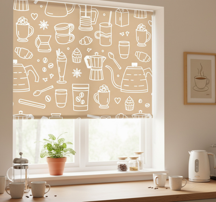 The Kitchen roller blind coffee cups and glasses pattern kitchen roller blind is an exquisite choice for home decoration because it effortlessly enhances the ambiance of your kitchen. With its unique design, it serves not only as a functional window covering but also as a captivating focal point. Imagine enjoying your morning coffee with the delightful imagery of coffee cups and glasses surrounding you, inspiring creativity and joy in your daily routine. Transform your kitchen into a cozy haven with this charming roller blind!