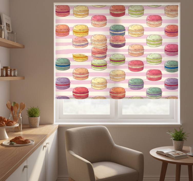 The Kitchen roller blind colorful macarons design kitchen roller blind is an ideal choice for those looking to enhance their kitchen's aesthetic. Its lively design sparks joy and creativity while providing essential privacy and light control. Transform your kitchen into a vibrant culinary haven with this charming roller blind, making every cooking experience enjoyable and inspiring!