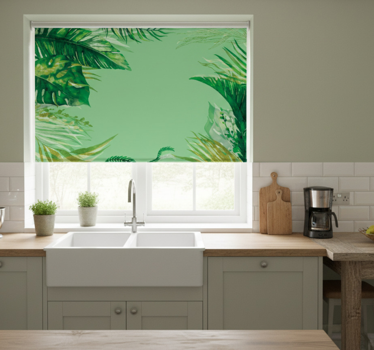 Reference: E8293Introducing our stunning Kitchen roller blind hand painted banana leaves, a perfect fusion of artistry and functionality! This exquisite design features hand-painted banana leaves that bring a touch of nature indoors, offering a vibrant yet soothing aesthetic. The intricate detailing and rich colors of the leaves create a refreshing atmosphere, making it the ideal choice for elevating your kitchen decor.