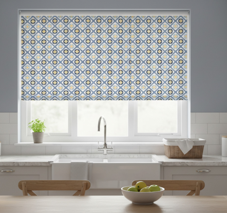 Reference: E6403Introducing our stunning Kitchen roller blind in baby blue and yellow tile, a beautiful fusion of vibrant colors and practical design! This delightful roller blind features an eye-catching baby blue and yellow tile pattern, seamlessly blending style and functionality. With its easy assembly in just 2 clicks, effortless cleaning, and the ability to regulate room temperature while providing privacy, it is the perfect addition to any kitchen decor. This product also allows you to enjoy natural light while keeping your space secure and stylish!