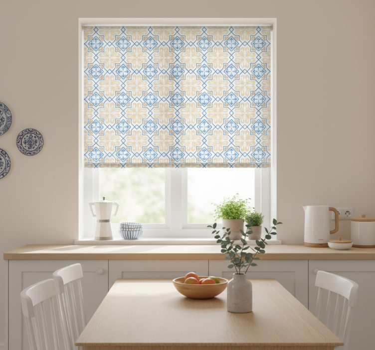 Reference: E6404Transform your space with our Kitchen roller blind in blue lines portuguese tile pattern, which beautifully combines elegance and functionality. This roller blind showcases a stunning design featuring intricate blue lines reminiscent of traditional Portuguese tile patterns. With easy assembly in just two clicks, this blind is not only a visual delight but also incredibly practical, allowing for quick cleaning and effortless disassembly. Protect your room from direct sunlight while maintaining your privacy and regulating the temperature, all while adding a touch of sophistication to your decor!