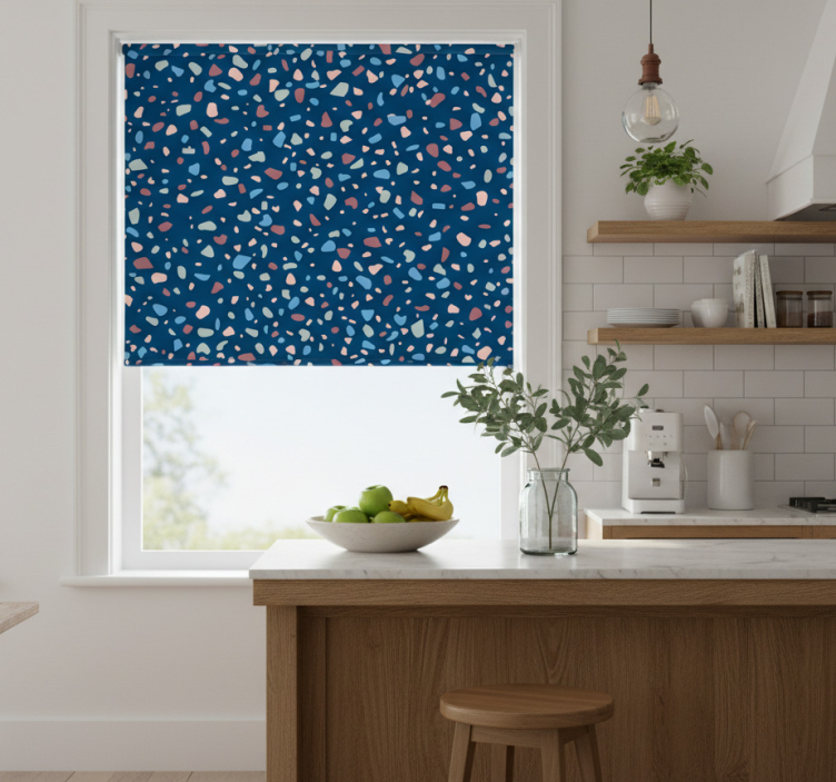 Reference: E6435Introducing our stunning Kitchen roller blind in dark blue terrazzo, a perfect blend of style and functionality! Featuring a captivating terrazzo design, this roller blind showcases a unique mix of irregular shapes in rich dark blue tones. Its sleek look offers an elegant touch to any kitchen decor while providing essential light control and privacy. With easy assembly and disassembly in just two clicks, this window treatment is not only visually appealing but also practical and convenient!