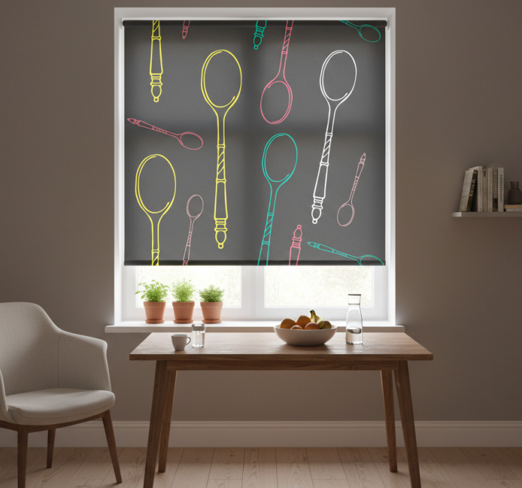 The Kitchen roller blind neon utensils design kitchen roller blind is an exceptional choice for anyone looking to enhance their kitchen's aesthetic. Its unique design brings a touch of fun and creativity to your space, inspiring culinary adventures! Imagine cooking in a kitchen that reflects your personality, where every glance at the vibrant design sparks joy and creativity. This roller blind not only serves a practical purpose but also uplifts your kitchen decor, making it a delightful environment to gather with family and friends.