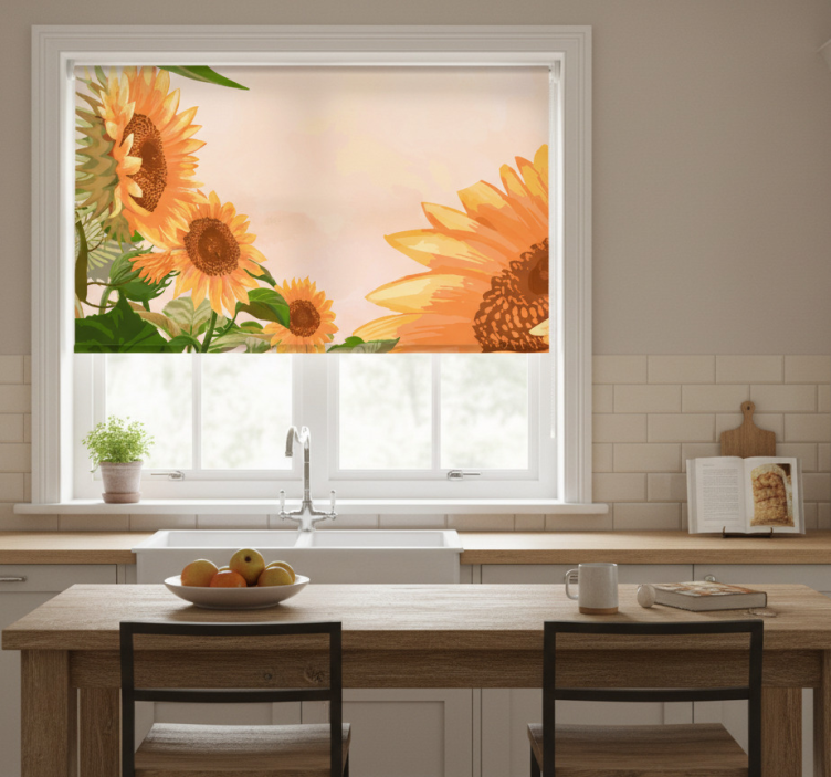 Reference: E8401Brighten up your living space with our Kitchen roller blind painted sunflowers, featuring a stunning design that showcases vibrant sunflowers against a soft background. This exquisite roller blind effortlessly blends style and functionality, offering easy assembly in just two clicks, effortless cleaning, and the ability to regulate room temperature while ensuring privacy. The cheerful sunflower motif will infuse your kitchen with warmth and charm, making it a delightful focal point!