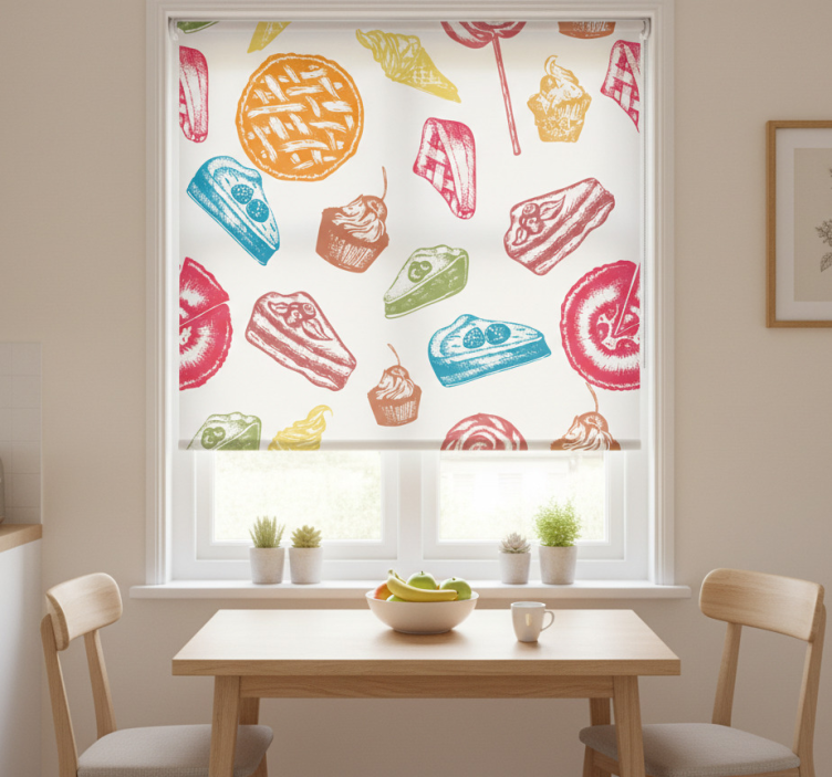 The Kitchen roller blind sweet treats design kitchen roller blind is an ideal choice for anyone looking to enhance their kitchen's charm. This beautifully designed roller blind brings a sense of joy and creativity to your space, making your culinary area feel more inviting. With its vibrant colors and playful motifs, it transforms your kitchen into a delightful haven, ensuring that every meal feels special. Let your kitchen reflect your personality!