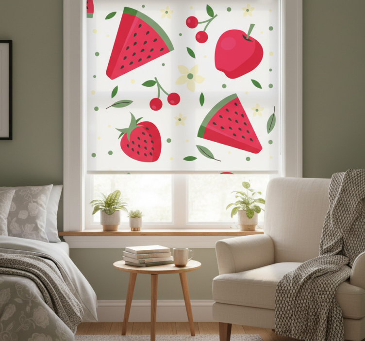 Reference: E8425Introducing our stunning Kitchen roller blind with assorted fruit pattern, designed to bring a burst of color and cheer to your kitchen space! This delightful blind features a vibrant assortment of fruits, showcasing a playful design that harmoniously blends functionality with aesthetic appeal. Its easy assembly in two clicks ensures a hassle-free installation, while its easy-to-clean fabric makes maintenance a breeze. This roller blind not only protects your room from harsh sunlight but also provides privacy when lowered, allowing you to enjoy your space comfortably. Additionally, it helps regulate the room temperature, enhancing your overall comfort. With 100% customizable measurements, you can tailor it to fit your window perfectly, and choose from three different textures based on your desired light and privacy levels!