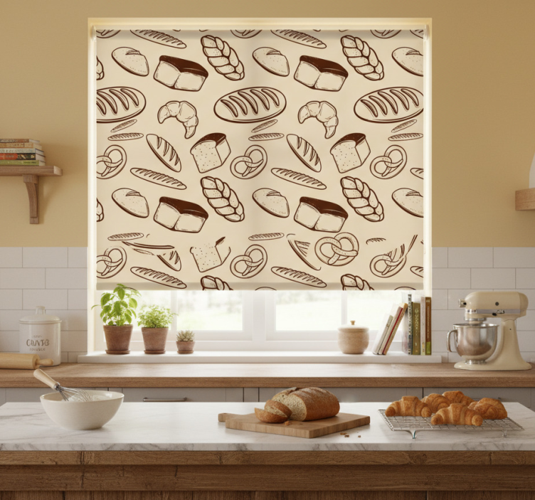 Reference: E6288Introducing our stunning Kitchen roller blind with bakery elements pattern, featuring delightful designs that inspire warmth and creativity in your culinary space! This unique roller blind showcases charming bakery motifs, including whimsical cupcakes, aromatic bread loaves, and delicate pastries, all artfully arranged to create a cozy atmosphere that invites you to bake and enjoy. The blend of soft colors and playful patterns not only enhances your kitchen's aesthetic but also brings a touch of joy and personality into your home!