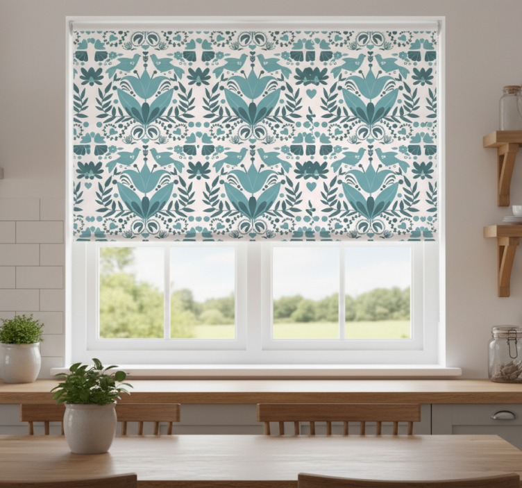 Reference: E6410Transform your living space with our Kitchen roller blind with blue folk art birds pattern. This exquisite design showcases intricately detailed blue folk art birds against a vibrant background, creating a stunning visual that breathes life into any kitchen. The delightful pattern is not only a feast for the eyes but also serves a functional purpose, ensuring your home is both stylish and comfortable.