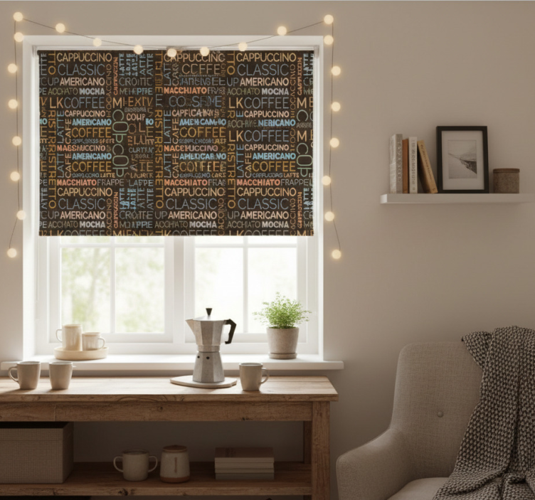 Reference: E6508Transform your kitchen with our stunning Kitchen roller blind with coffee text design! This unique roller blind features a delightful coffee-themed graphic that brings warmth and charm to your space. With its easy assembly in just 2 clicks, effortless cleaning, and customizable measurements, this roller blind is perfect for any coffee lover's kitchen. Enjoy the benefits of regulating room temperature while ensuring privacy when lowered, all while enhancing your decor!