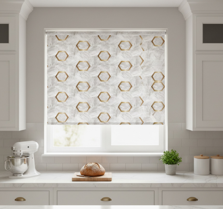 Reference: E6352Introducing our stunning Kitchen roller blind with grand gold marble hexagons, a perfect blend of elegance and functionality! This unique design features luxurious gold marble hexagons that create a sophisticated yet inviting atmosphere in any kitchen. With its easy assembly in just two clicks, effortless cleaning, and the ability to regulate room temperature while providing privacy, this roller blind is more than just a window covering; it's a statement piece that enhances your home decor!