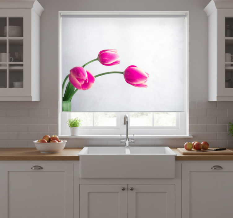 The Kitchen roller blind with three tulips on white kitchen roller blind is not just a window covering; it is a statement piece that transforms your kitchen into a charming retreat. Its lovely floral design adds a touch of elegance and warmth, making it ideal for creating an inviting environment for family gatherings or entertaining guests. Imagine the delight of cooking in a space that inspires creativity and joy! This roller blind enhances your kitchen's overall décor while providing essential privacy and light control.