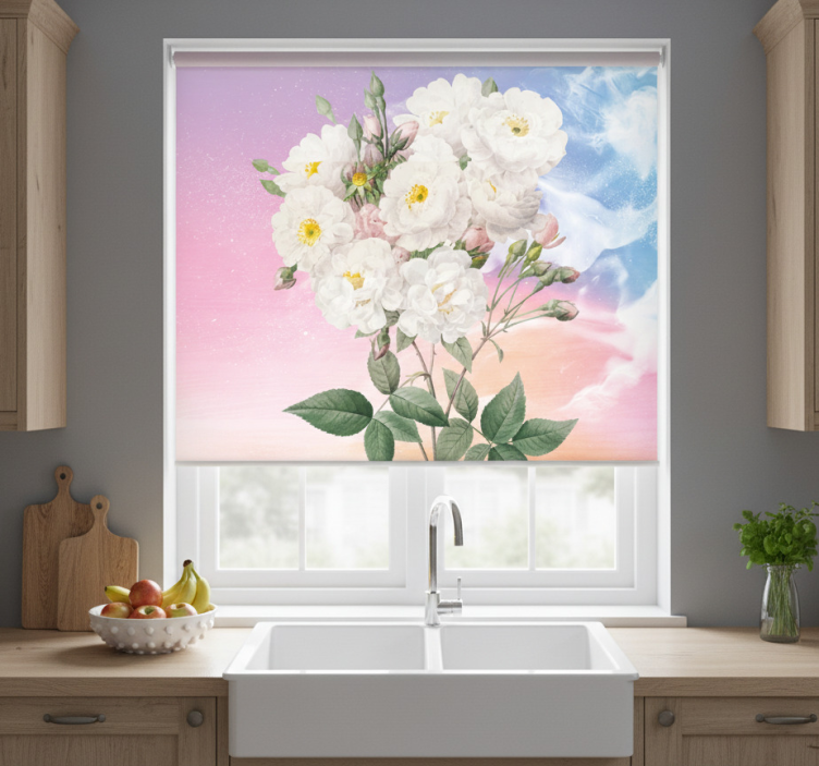 Reference: E8332The Kitchen roller blind with white flowers on blue orange is a delightful blend of elegance and functionality. Featuring a stunning design of delicate white flowers set against a vibrant blue and orange backdrop, this roller blind instantly elevates your kitchen decor. Its cheerful colors bring a touch of warmth and brightness to any space, making it an ideal choice for those who love to infuse their home with personality and charm.