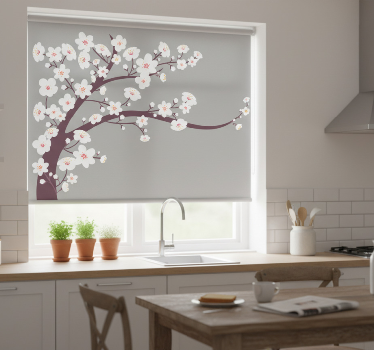 Our Kitchen roller blind with white flowers on gray kitchen roller blind is not just a practical window covering; it serves as a stunning decorative element that elevates your interior design! Picture the gentle floral motifs bringing a touch of nature indoors, creating a warm and inviting ambiance. This roller blind seamlessly combines style and utility, enhancing the overall beauty of your kitchen while providing necessary privacy and light control. Let your kitchen shine with this exquisite piece!