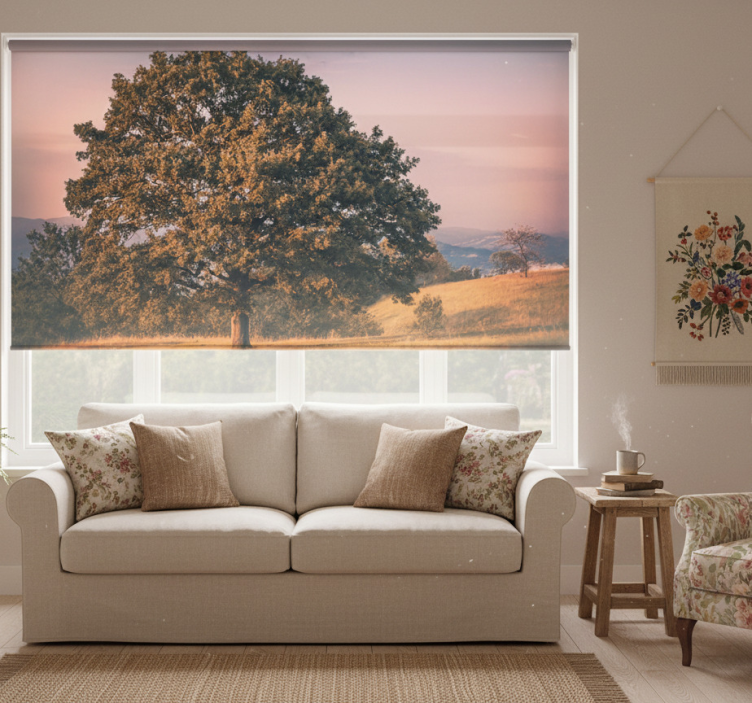 Reference: E8568Transform your living space with our Living room roller blind in old tree cottagecore style. This stunning design features a whimsical blend of nature-inspired motifs and soft, earthy tones, evoking the charm of a cozy cottage nestled among ancient trees. The roller blind is not just a window treatment; it is a statement piece that enhances your decor while offering practicality. With features like easy assembly in 2 clicks, effortless cleaning, and customisable measurements, this roller blind is perfect for anyone looking to elevate their home.