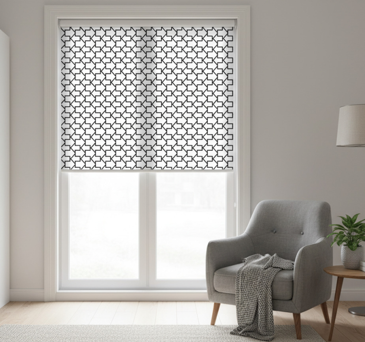 Reference: E7650Introducing our Modern roller blind geometric arrows black lines pattern, a stunning fusion of contemporary design and functional elegance! This unique roller blind showcases an artistic arrangement of geometric arrows in striking black lines, creating a visually appealing backdrop that complements any modern interior. It is not only stylish but also practical, offering easy assembly in just two clicks, effortless cleaning, and a design that enhances your decor while effectively regulating room temperature.