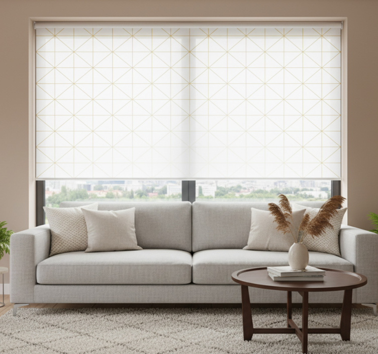 Reference: E9083Introducing our Modern roller blind gold geometric design, a stunning blend of elegance and simplicity. This unique design features a captivating gold geometric pattern that effortlessly enhances your living space, creating an atmosphere of sophistication. The roller blind is not only visually appealing but also practical, offering easy assembly and disassembly in just two clicks, as well as easy cleaning and maintenance. It protects your room from direct sunlight, provides privacy when lowered, and helps regulate room temperature. With 100% customizable measurements and three different textures to choose from, you can find the perfect fit for your needs!